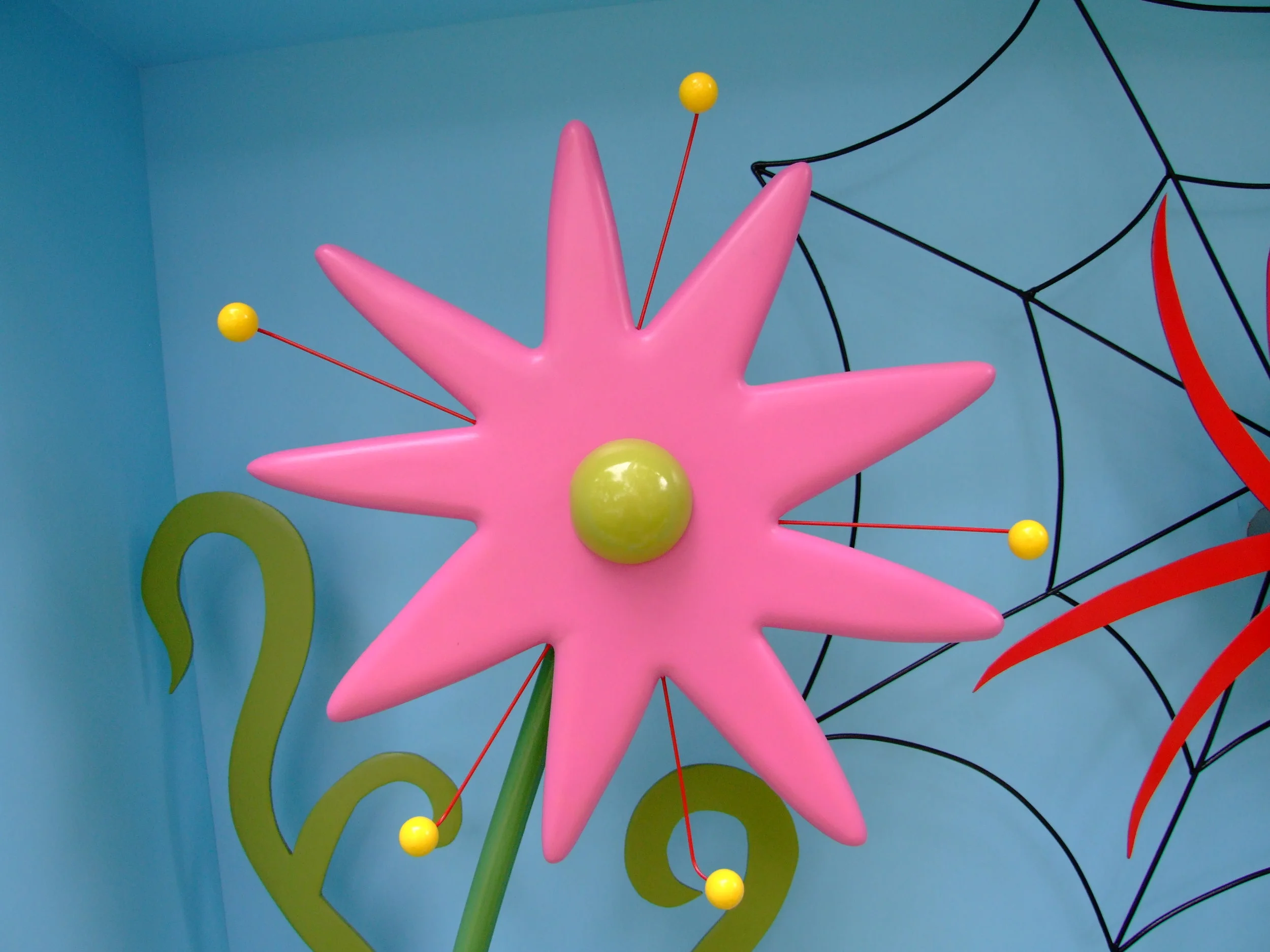 Butterfly Aviary Corridor in the Imaging Center at Monroe Carell Jr. Children’s Hospital at Vanderbilt illustrates an interactive garden filled with blooming flowers and bugs that flap their wings. By spinning the red wheels an inch worm climbs a flower stem and Ms. Spider spins her web.